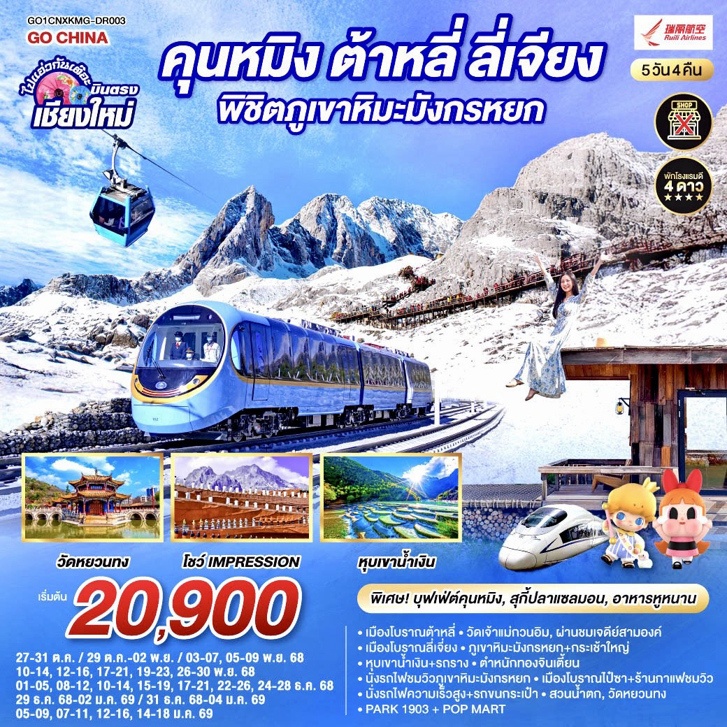 บินตรงเชียงใหม่ คุนหมิง ต้าหลี่ ลี่เจียง ภูเขาหิมะมังกรหยก 5 วัน 4 คืน นั่งรถไฟความเร็วสูง 1 เที่ยว + นั่งรถไฟชมวิว โดยสายการบิน Ruili Airlines (DR) ** เที่ยวเต็มอิ่ม..ไม่ลงร้านช้อป** |